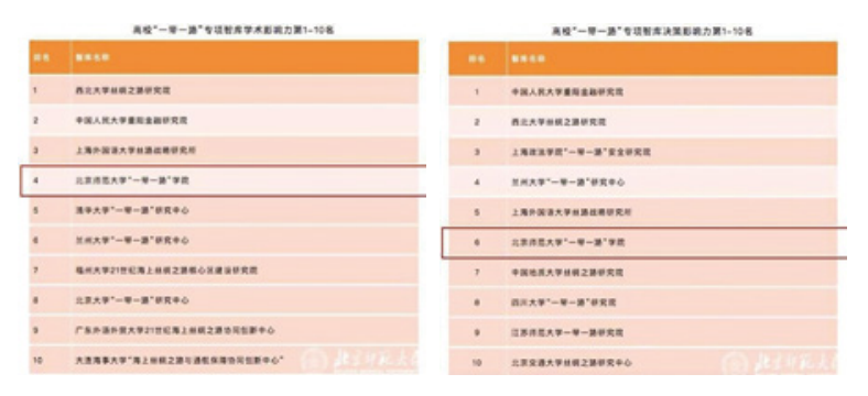 The Report on the Influence of The Belt and Road Special Think Tank of Chinese Colleges and Universities has been published by Northwest University for six consecutive years, which has an important influence in the Belt and Road think tanks field in China. The Belt and Road School of BNU ranks the top three in terms of comprehensive and international influence of think tanks, and ranks fourth in the academic influence of that, while ranks sixth in the decision-making influence of that.