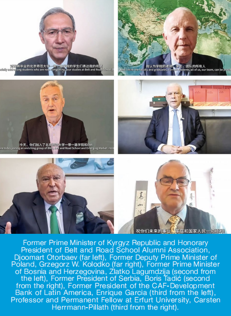 Former Prime Minister of Kyrgyz Republic and Honorary President of the Belt and Road School Alumni Association, Djoomart Otorbaev; along with former Deputy Prime Minister of Poland, Grzegorz W. Kolodko; former Prime Minister of Bosnia and Herzegovina, Zlatko Lagumdzija; former President of Serbia, Boris Tadić; former President of the CAF-Development Bank of Latin America, Enrique Garcia; Professor and Permanent Fellow at Erfurt University, Carsten Herrmann-Pillath and Professor Pan Qingzhong, Executive Vice Dean of Schwarzman College at Tsinghua University, along with other distinguished professors from BRS and prominent alumni representatives from around the globe, extended their heartfelt congratulations. They celebrated the achievements of BRS over the past decade and offered their best wishes to the graduating class of 2024. They emphasized that BRS has long been committed to nurturing future leaders from developing countries. The experiences gained at BNU can help international students learn from China's successful development and deepen their understanding of the roles that China and BRI play in today's world, which is highly consequential for the advancement of their home countries. They encouraged the graduates to face new challenges together, strive to promote the high-quality development of Belt and Road cooperation, and foster mutual development between developing countries and the global community, illuminating the path toward a more prosperous, equitable, and hopeful future for all.