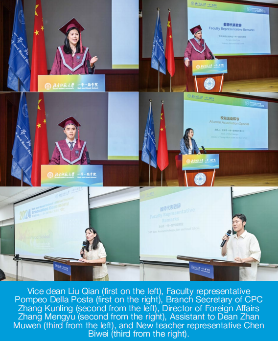 At the commencement ceremony, Liu Qian, the Vice Dean of BRS, extended her warm congratulations to the class of 2024. She highlighted that a decade of experience in training talent from developing countries was a tremendous asset for BRS and serves as the foundation for establishing a global alumni network for BRI. Liu encouraged the graduates to embrace their mission of nurturing future leaders for developing countries and expressed her hopes for their reunion on the international stage. Faculty representative Pompeo Della Posta reminisced fondly about the wonderful moments shared with students. He reiterated the school's motto, "For a Better World," and inspired the graduates to take on their responsibilities by fostering understanding, building mutual trust, and contributing to collaborative development across nations. New teacher representative Chen Biwei conveyed his confidence in and expectations for the graduates, urging them to fully leverage the knowledge and skills they acquired while studying in China to make a meaningful impact on global progress in their future leadership roles.