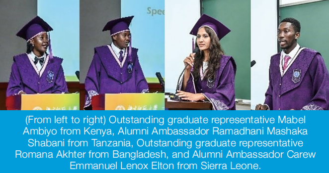 Outstanding graduate representatives from Kenya and Bangladesh, Mabel Ambiyo Omurambi and Romana Akhter, conveyed their heartfelt gratitude for the invaluable resources and opportunities provided by the School, as well as the high-quality curriculum and dedicated guidance from their teachers. They encouraged their fellow classmates to apply the knowledge and experiences gained in China to benefit their home countries. Alumni ambassadors from Tanzania and Sierra Leone, Ramadhani Mashaka Shabani and Carew Emmanuel Lenox Elton, expressed their commitment to actively embracing leadership roles as alumni ambassadors. They aim to foster the development of a global alumni network for BRS, create more opportunities for fellow alumni, maintain strong connections with the school and China, and collaborate towards global prosperity by addressing critical issues such as poverty alleviation and economic development.