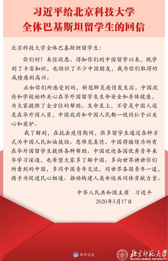 During his return to China, Huang Jintai, a student from Malaysia, received the anti-epidemic materials and care from BNU, and personally realized that "Life is the highest" in President Xi's reply and "The Chinese government and schools always care about the life safety and health of overseas students in China". Zeb Johar from Pakistan expressed his love for China. He said that with the efforts of the Chinese government, international students can live in a friendly and safe environment, and he never felt far away from home. Paul, a student from Egypt, described China's contribution to the epidemic by saying "A friend in need is a friend indeed". He said that China makes the world know more about true friendship. Arashi Sato from Japan saw the importance of unity through the friendship and mutual assistance between China and Japan during the outbreak, and hoped that he could become a bridge of friendship between China and Japan, contribute to the unity of China and Japan, and bring good influence to the world. Bai Yan, a Chinese student, put forward his own thoughts on the development of science and technology. He said that this outbreak is a wake-up call for us to pay more attention to basic scientific research. Young people should bear in mind the words of General Secretary Xi, strengthen academic exchanges and cooperation, and improve the level of science and technology.