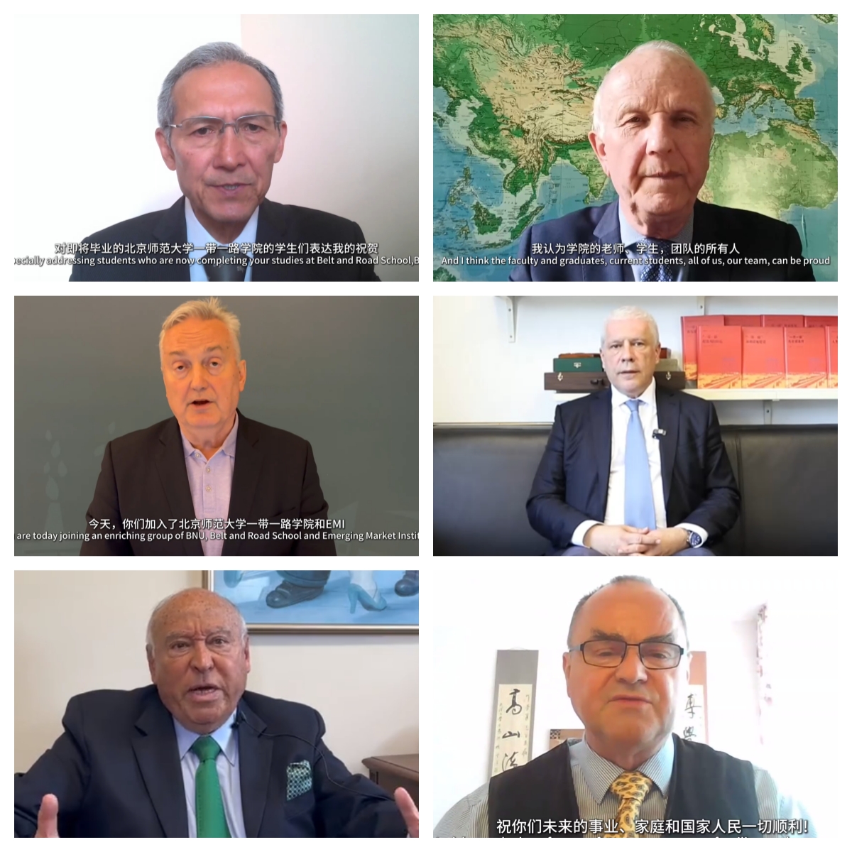 吉尔吉斯共和国前总理、一带一路学院校友会荣誉主席卓奥马尔特·奥托尔巴耶夫(Djoomart Otorbaev)、波兰前副总理格泽高滋·W·科勒德克(Grzegorz W. Kolodko)、波黑前总理兹拉特科·拉古姆季亚(Zlatko Lagumdzija)、塞尔维亚前总统鲍里斯·塔迪奇(Boris Tadić)、拉美开发银行前行长恩里克·加西亚(Enrique Garcia)、德国埃尔福特大学终身教授何梦笔(Carsten Herrmann-Pillath)、清华大学苏世民学院常务副院长潘庆中教授等一带一路学院特聘教授,以及全球优秀校友代表等也纷纷发来祝福,对学院十年来所取得的成就表示祝贺,并对2024届毕业生寄予美好祝愿。他们认为,学院长期以来致力于培养发展中国家未来领导者,在北师大的学习经历能够帮助留学生学习中国发展经验,更深刻地认识中国和“一带一路”倡议在现代世界中所扮演的角色,这对相关国家发展具有重要意义。他们勉励毕业生们,共同应对新的挑战,努力推动高质量共建“一带一路”,促进发展中国家和世界的共同发展,共同引领世界走向更加美好、繁荣、公正的未来。