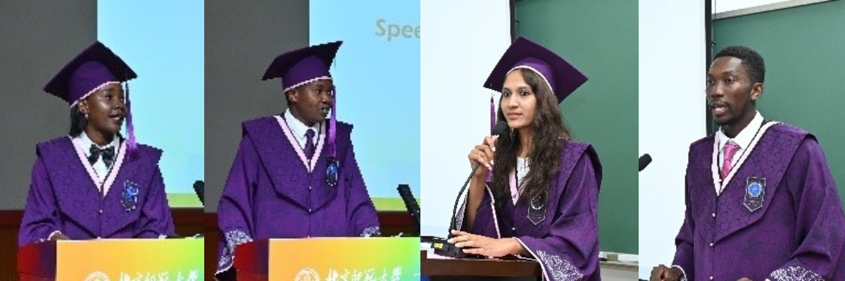 来自肯尼亚和孟加拉国的优秀毕业生代表爱慕(Mabel Ambiyo Omurambi)和柔曼娜(Romana Akhter)用真挚的语言表达了对学校提供宝贵资源和机会、学院优质的课程设置和老师们悉心指导的感谢,并号召同学们将在中国学习的知识和宝贵经验贡献于自己的国家。来自坦桑尼亚和塞拉利昂的校友大使马瀚文(Ramadhani Mashaka Shabani)和李思(Carew Emmanuel Lenox Elton)在发言中表示,作为校友大使,他们将会积极承担领导者的责任,推动构建一带一路学院全球校友网络,为校友创造更多发展机会,保持与学院、学校和中国的紧密联系,在消除贫困、经济发展等领域,为迈向世界繁荣而共同努力。