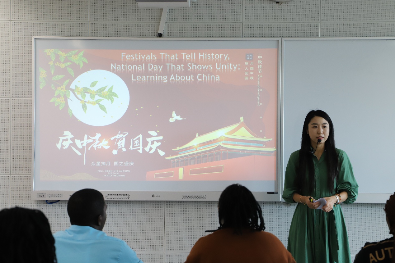 活动伊始,发展中国家硕士项目主管、基础汉语教师李珈宁为学员们系统讲解了国庆节与中秋节的起源、习俗与文化内涵。从国庆节象征的国家统一与民族团结,到中秋节蕴含的家庭团圆与社会和谐,深入浅出地阐释了中国人“家国同构”的文化理念。